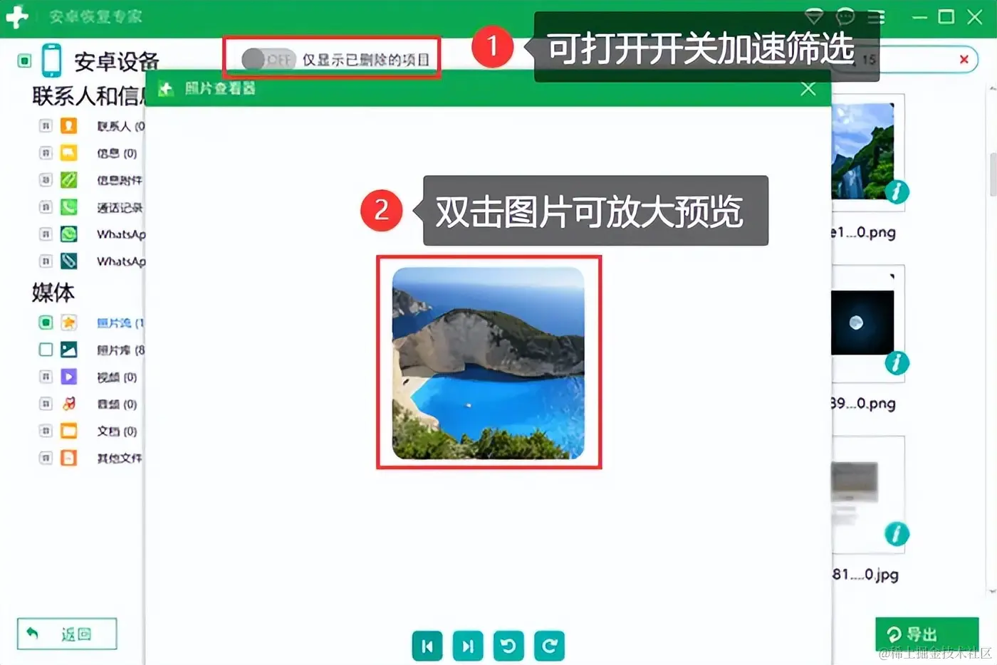 步骤3:在照片列表中我们要找到需要恢复的照片,可以打开筛选开关进行查找,也可以放大图片再进行查找。