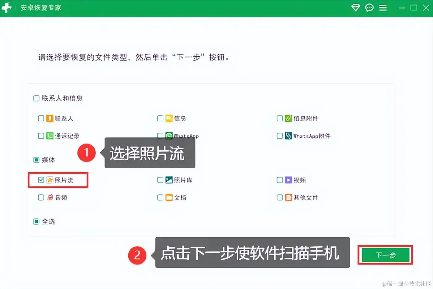 步骤2:连接好之后我们需要选择文件类型,需要恢复的是手机照片,所以勾选 【照片流】 即可。然后点击 【下一步】 ,软件就会开始扫描手机数据。