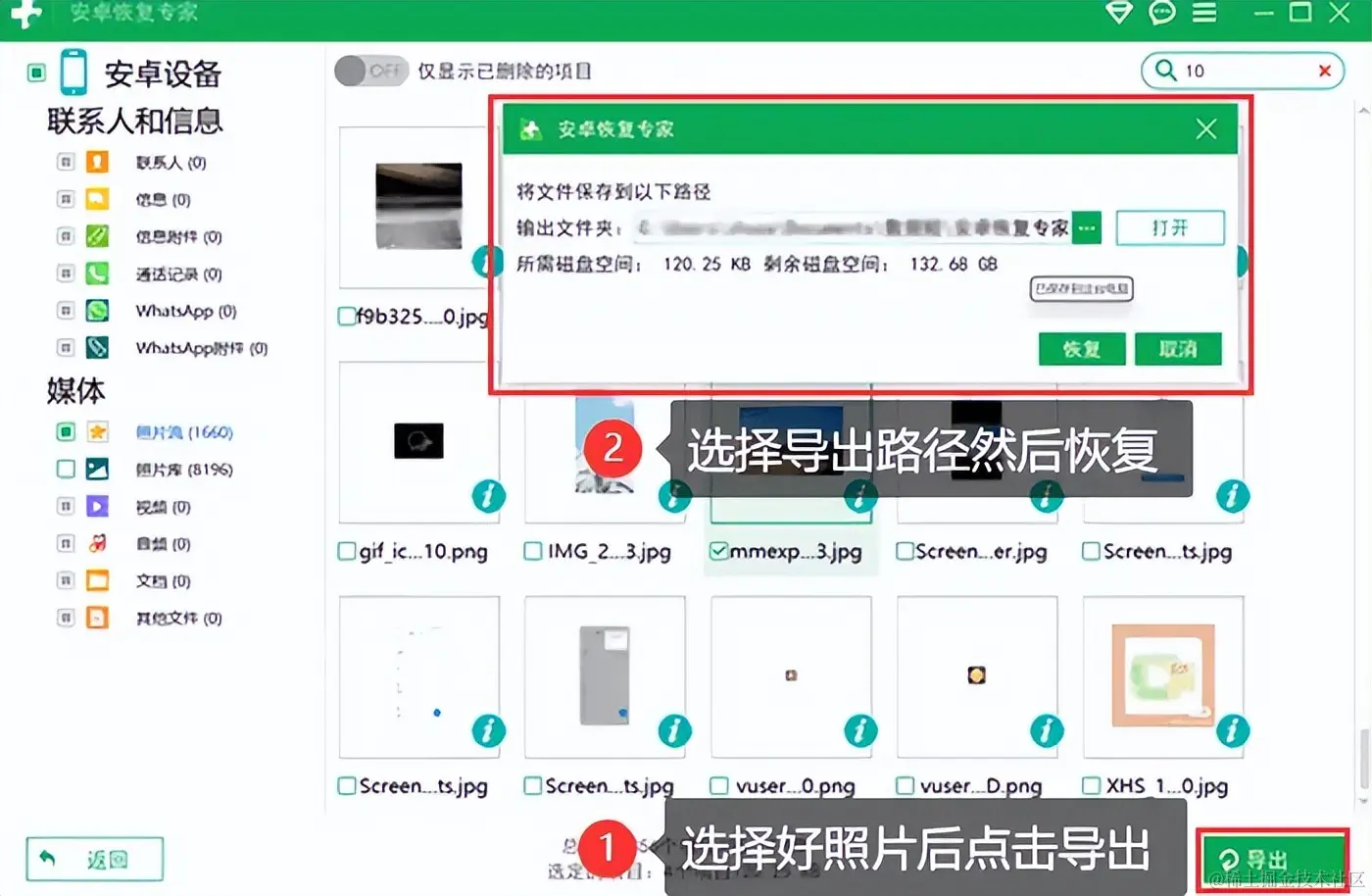 步骤4:选择好照片后,我们先点击右下角的 【导出】 ,然后在弹出的框里选择恢复路径,并记住。恢复完成后要记得及时查看是否恢复成功。