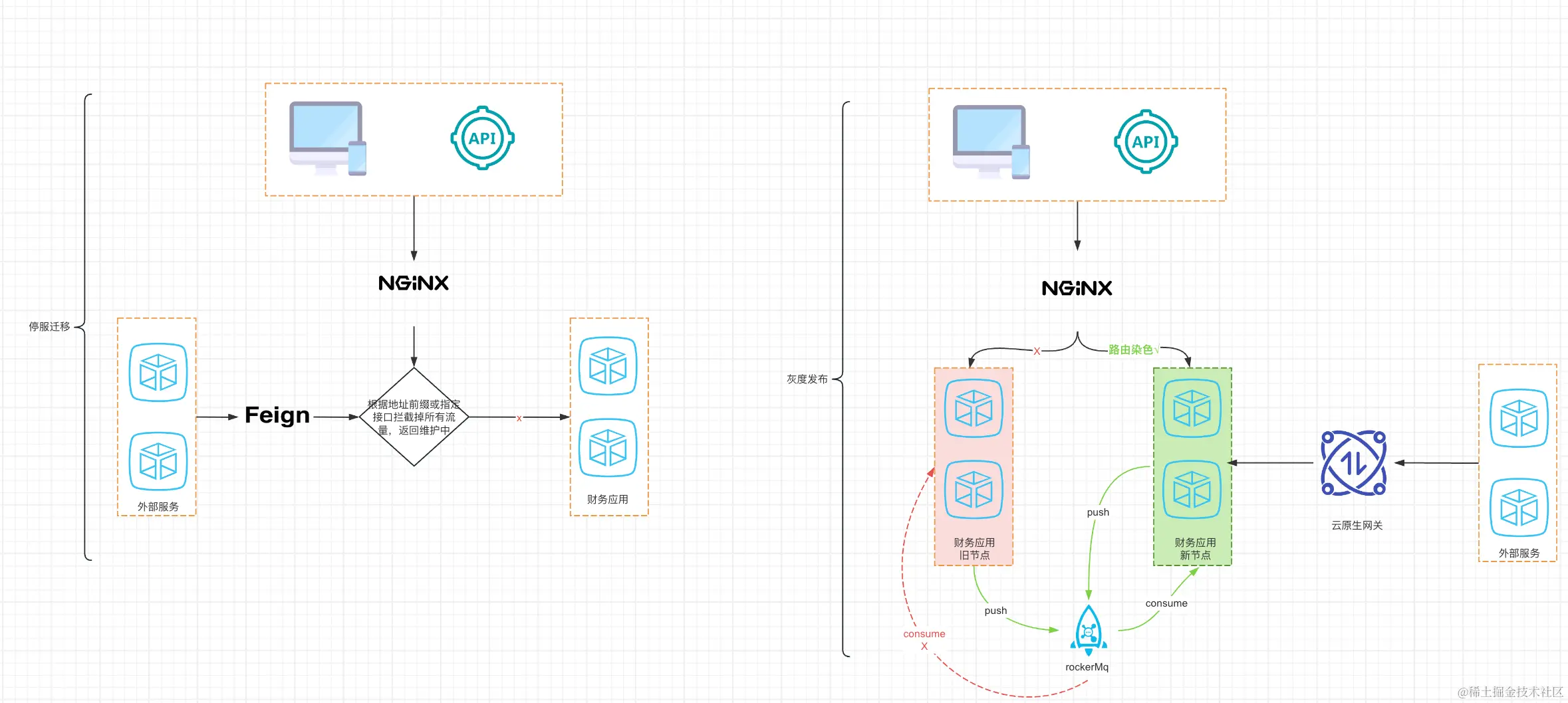| 缺点 | 需要停服通知业务端针对⾦融内部调⽤财务的接⼝,需修改代码,增加开关逻辑 | mq消息消费问题⽆法解决fegin调⽤接⼝也需要梳理,转发复杂度较⼤ |