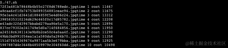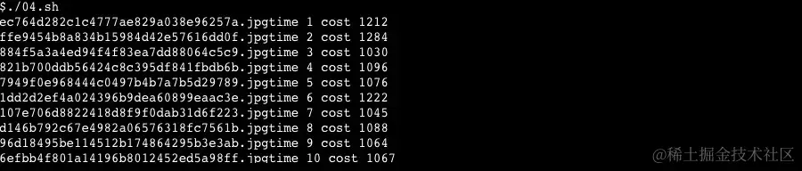 然后写了一段 Shell 脚本用来多次进行图片上传并进行即时。04.jpeg 是一个 0.4M 大小的图片,也是我们让用户上传图片的平均大小。