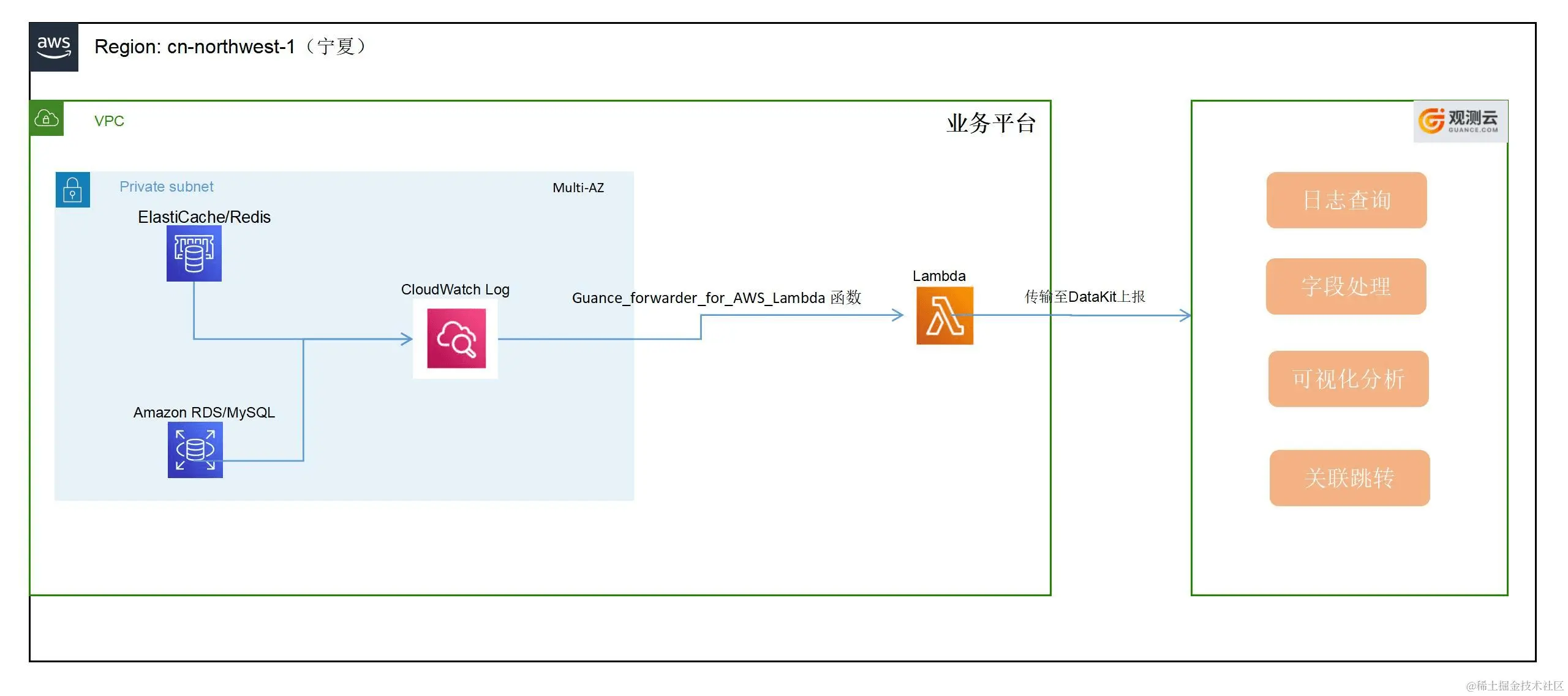 如下图所示,观测云可以通过采集 Amazon CloudWatch Logs 的 RDS 日志,来实现存储、查询、分析以及可视化服务。