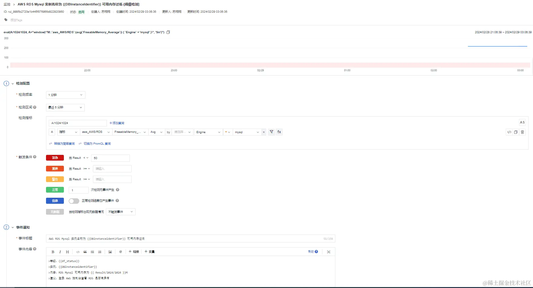 在监控器内部,配置需要监测的指标来源、检测条件、通知内容、通知对象后,点击保存即可使该监控器生效。后续如果被监测对象出现异常,用户可通过工作空间的「事件」菜单,查看对应告警的详情。