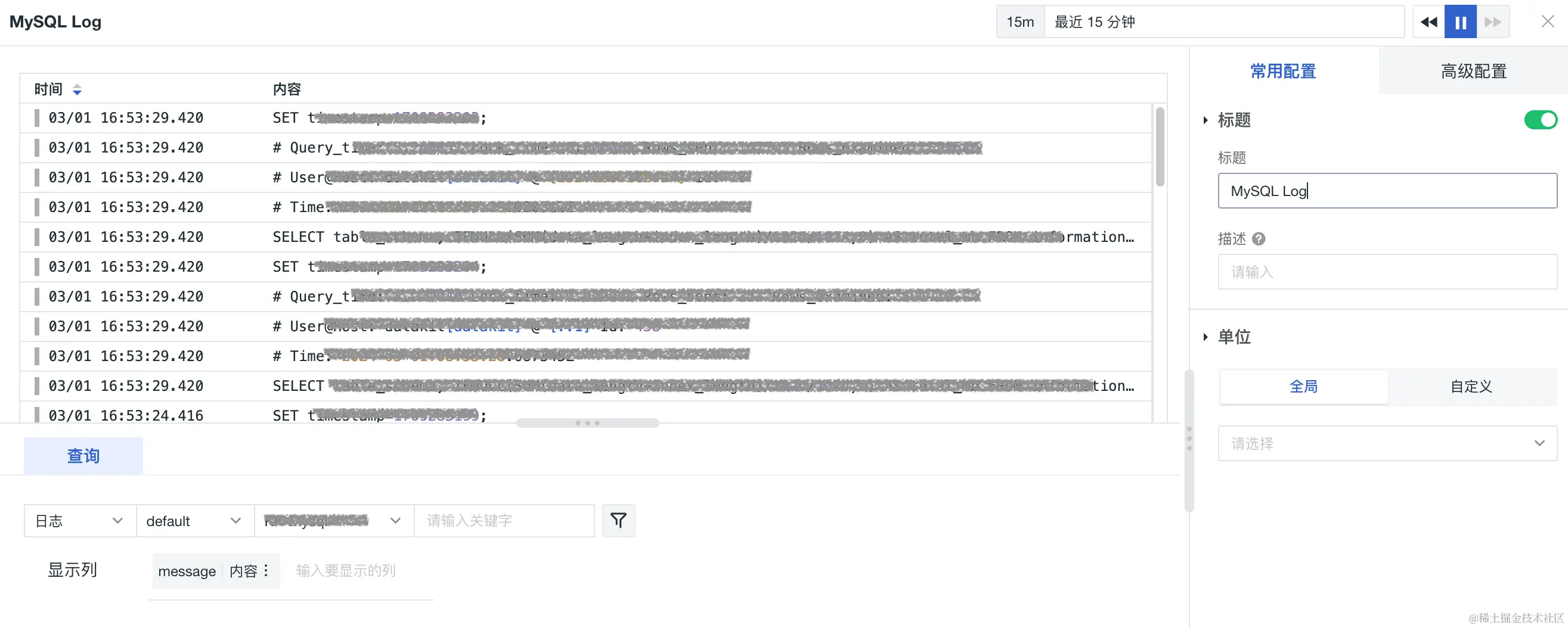 使用观测云带来的一个关键价值点是用户可以按自身监控需求,将不同的数据集中在一个仪表板中进行关联展示,通过数据标签或时间标签,筛选同一故障时刻的指标和日志内容进行关联展示,提升问题分析的效率。为实现这个效果,需要点击进入对应的仪表板,通过添加图表的方式,在当前时序仪表中增加日志查看器。并编辑日志来源,选择对应 MySQL 的慢日志或 Redis 服务的日志,使日志和指标在同一个仪表板中展示: