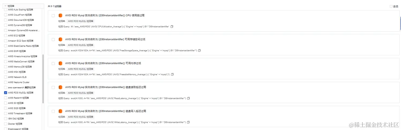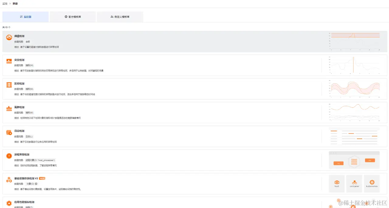 针对标准云服务产品,观测云也提供了预置的标准监控模板,为用户提供开箱即用的告警配置体验。