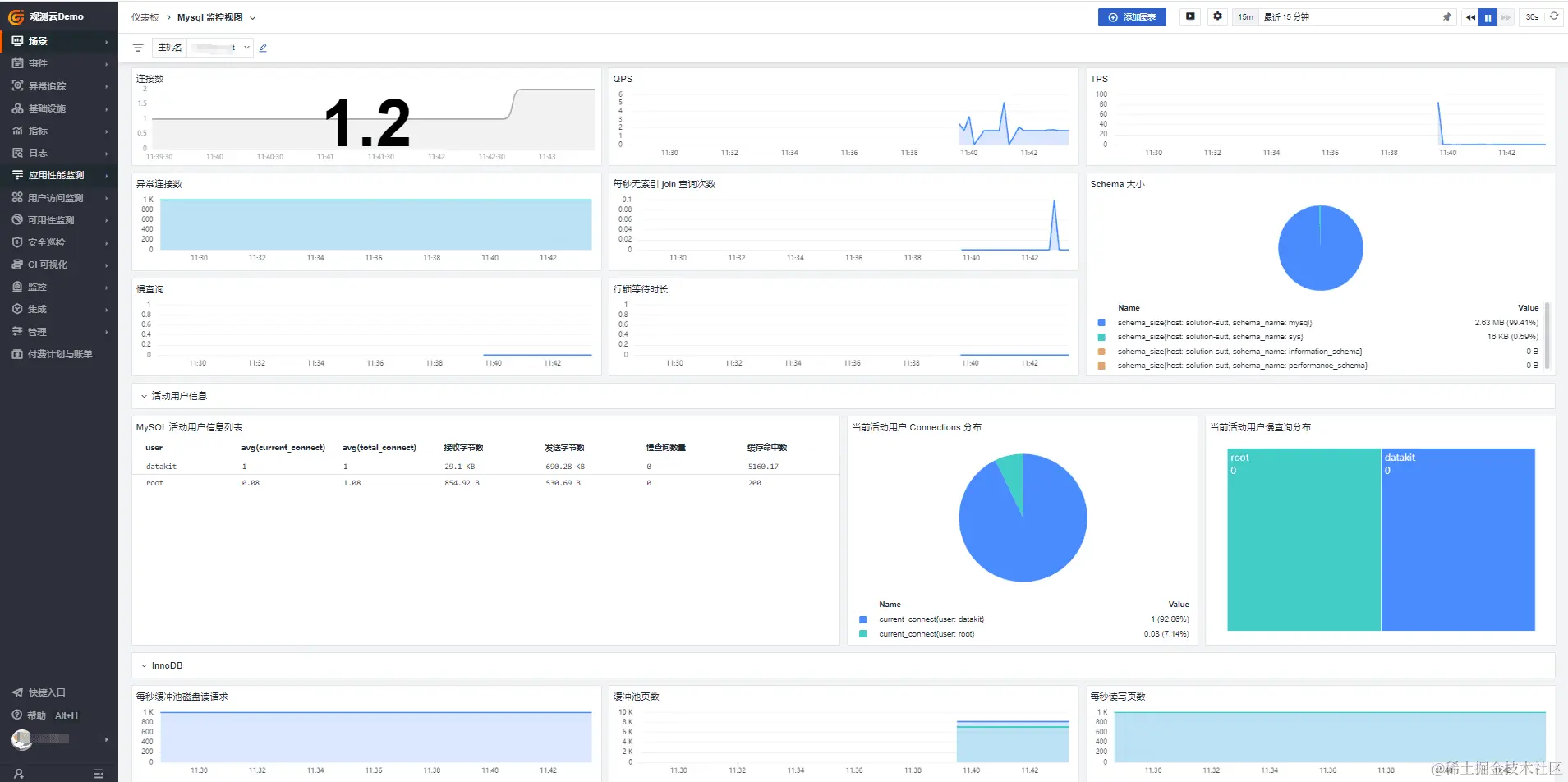 观测云提供 RDS 监控视图标准模版,包括查询响应时间、并发连接数、事务吞吐量、慢查询、缓冲池使用率等指标,如上图 RDS 采集指标所示,相对于 RDS 控制台指标可以提供更多的指标分析并可结合 RDS 日志做更进一步可视化分析。