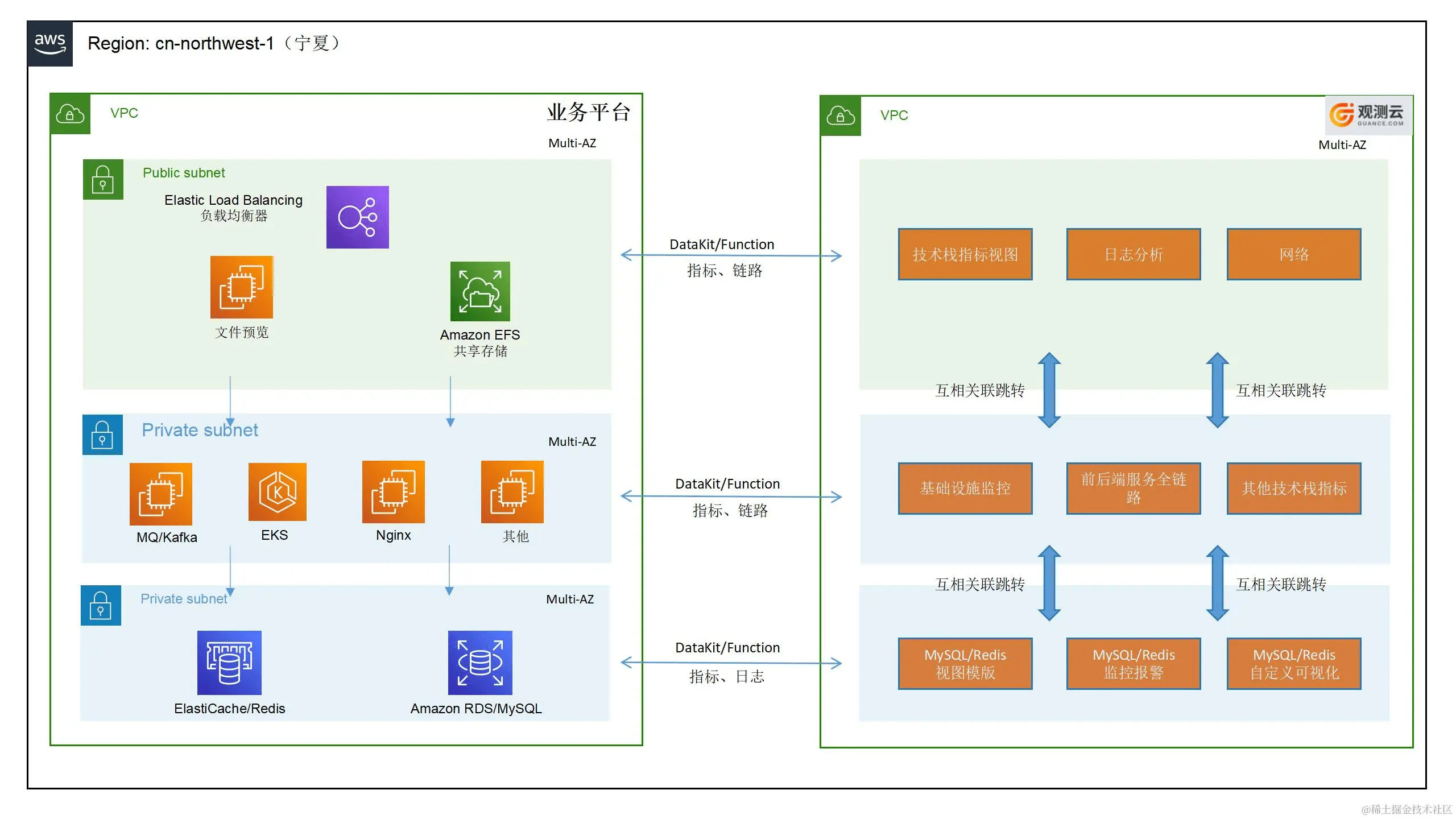CloudWatch 是 亚马逊云科技提供的一项监控服务。开发人员和系统管理员可通过 CloudWatch 收集、监控和分析与亚马逊云科技基础架构和应用程序相关的日志文件和指标数据。观测云通过对接 CloudWatch 获取基础数据,借助自身数据清洗打标能力和自定义数据展示能力,为开发人员和系统管理员定制自定义统一观测仪表板提供便利,使用户更灵活的构建云服务观测场景。除此之外,观测云通过 DataKit 可以直接采集数据库的性能指标,对的 CloudWatch 的监控进一步增强。