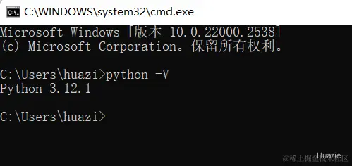 在命令行窗口内,输入 python -V 查看,如下图所示即为安装成功: