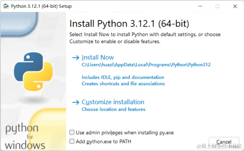 笔者这里下载的是 Python 3.12.1,安装界面如下图: