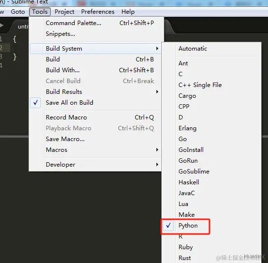 菜单栏选择 Tools => Build System,可能会看到如下的 Python,我们直接选择这个来编译下面的代码。