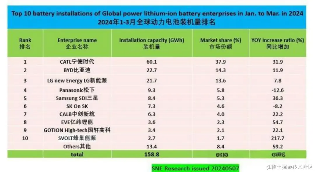 与此同时,据SNE Research发布的2024年一季度的全球动力电池装车量统计数据,宁德时代的电池装机量同比增长31.9%,再次以显著优势位居榜首。另动力电池联盟数据显示,今年一季度宁德时代国内市场份额为48.9%,同比提升4个百分点。