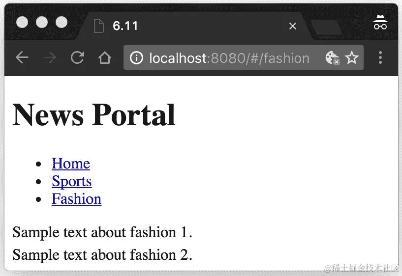 我们有一个带有三个链接和一个router-view入口点的标题。我们将为体育和时尚页面创建两个长页面: