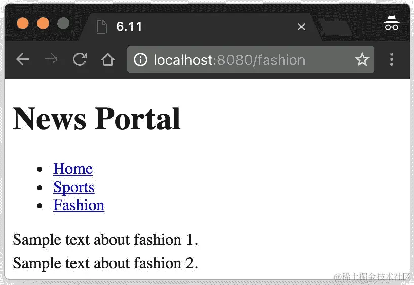 我们紧凑的历史服务器的作用是将每个 GET 请求重定向到index.html页面。这就是为什么当我们尝试直接访问http://localhost:8080/fashion时,我们不会得到 404 错误的原因。