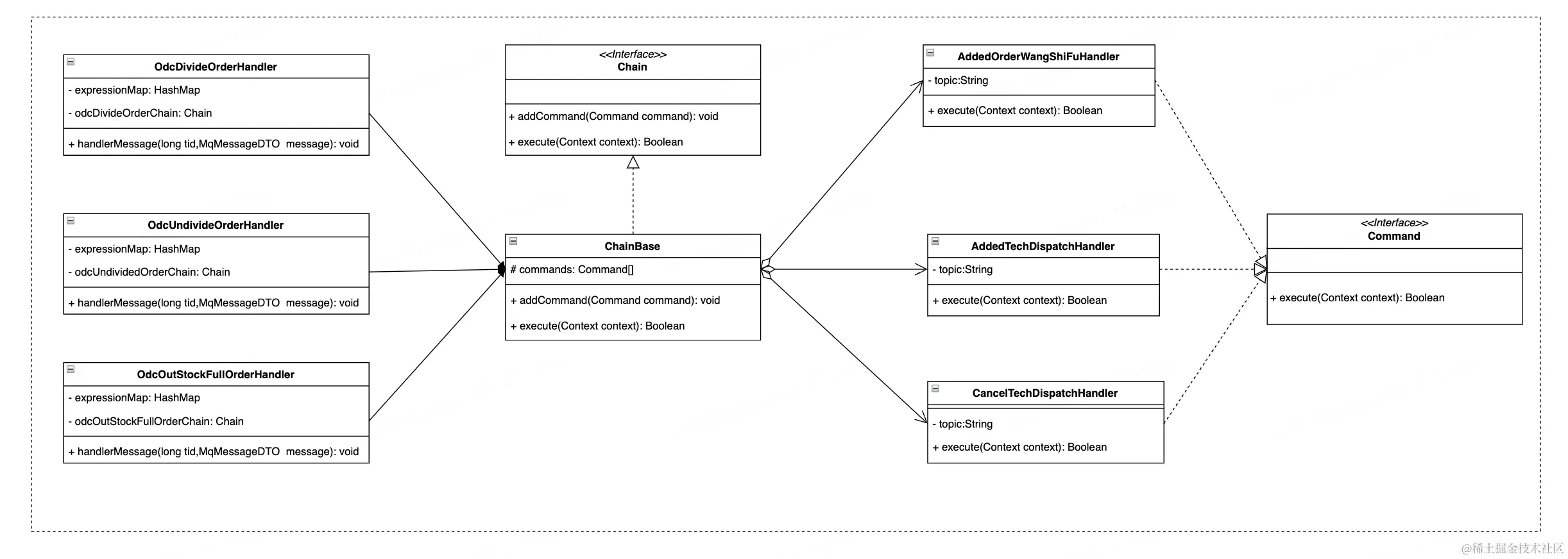解析: 消息处理Handler主要是将接收到消息转化Java Bean,再将具体的上下文内容下传给后续事件处理Handler。参数expressionMap存储的是MVEL表达式需要处理的内容,具体内容结合实际业务场景差异化设置,对于后续节点处理Handler扩展性有很大帮助。odcDivideOrderChain职责链的命令链类,后续各个节点的流转全靠它。