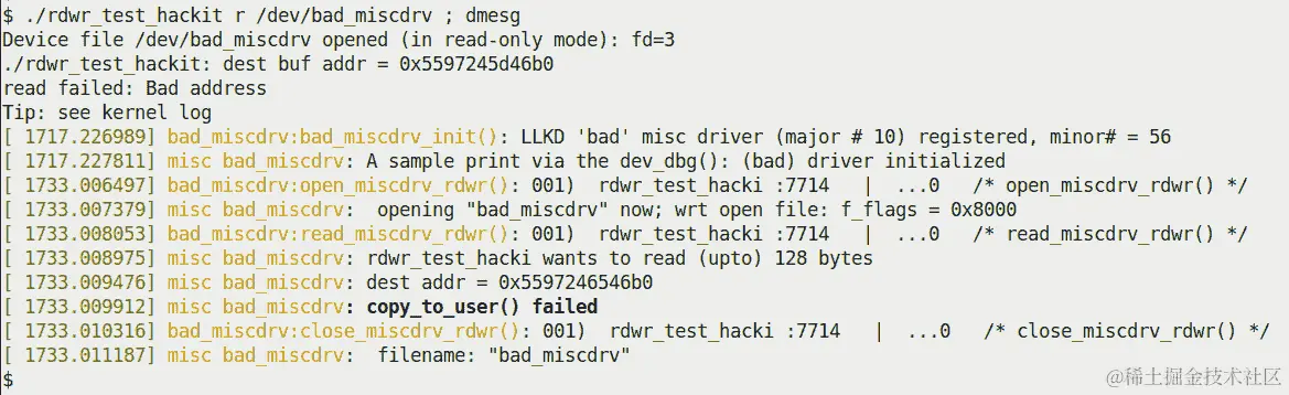如果黑客试图发出我们的驱动程序不知道的命令(相当笨拙的黑客),会发生什么?好吧,初始的有效性检查会捕捉到它;即使他们没有,我们将在ioctl方法中命中default情况,导致驱动程序向用户空间返回-ENOTTY。这将通过 glibc“粘合”代码将用户空间进程(或线程的)errno值设置为ENOTTY,通知它 ioctl 方法无法提供服务。我们的用户空间perror(3) API 将显示Inappropriate ioctl for device错误消息。事实上,如果驱动程序没有ioctl方法(也就是说,如果file_operations结构中的 ioctl 成员设置为NULL),并且用户空间应用程序发出ioctl方法,就会发生这种情况。