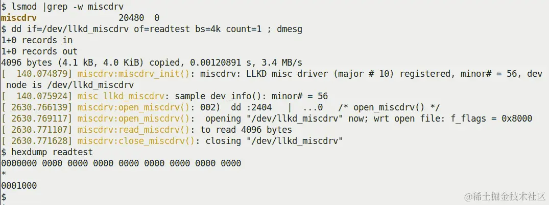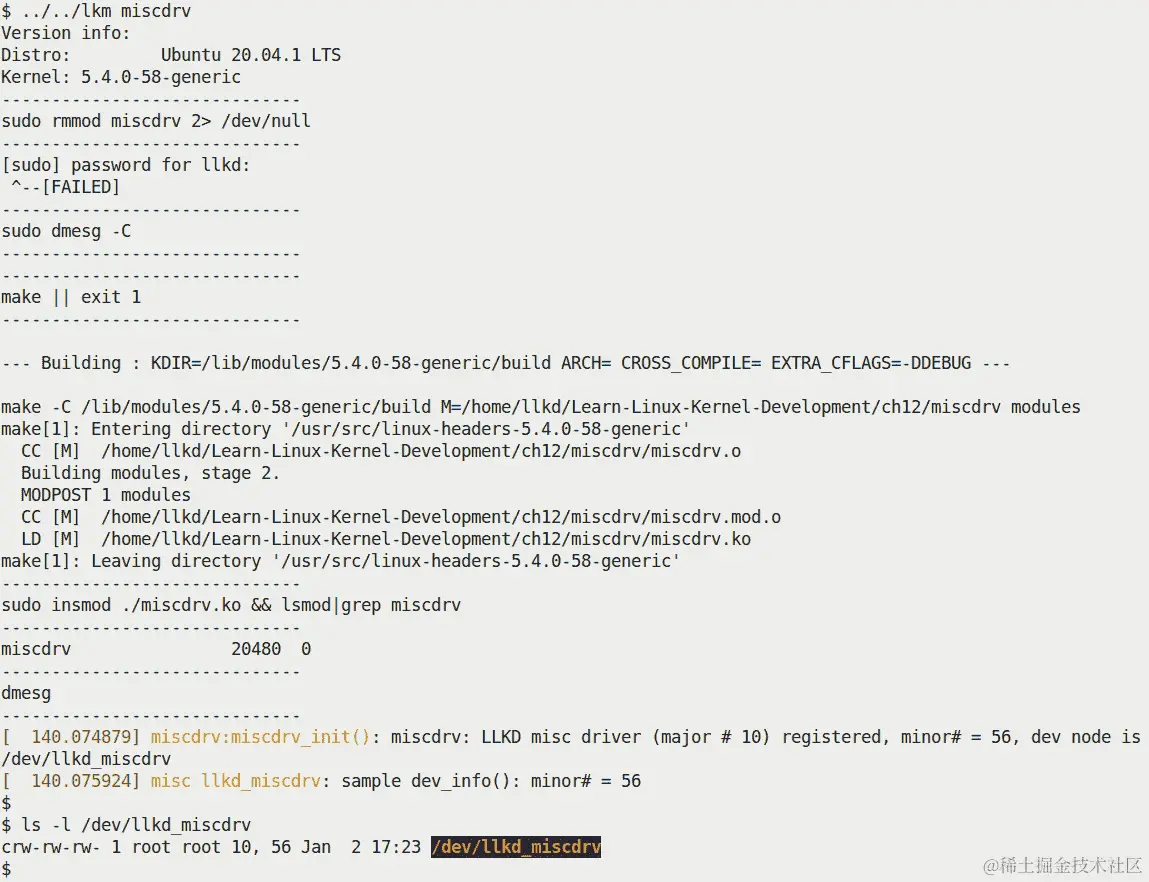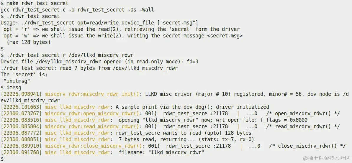 我把这个用户空间/驱动程序项目示例留给你来尝试;为了方便起见,一旦加载了驱动程序(通过 insmod),您可以使用ch2/userspace_ioctl/cr8devnode.sh便捷脚本生成设备文件。设置好之后,运行用户空间应用程序;您会发现连续运行它会重复切换我们虚构设备的“电源状态”。