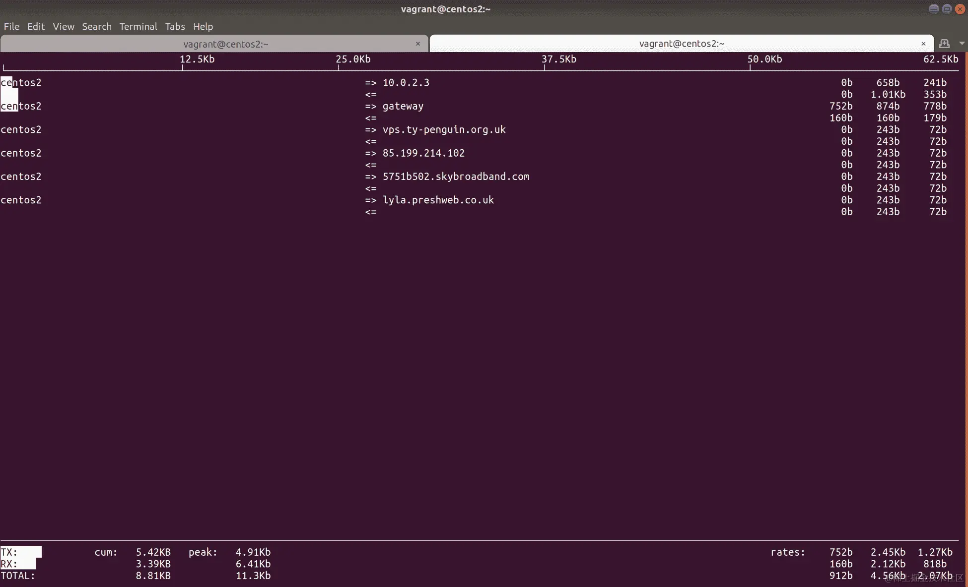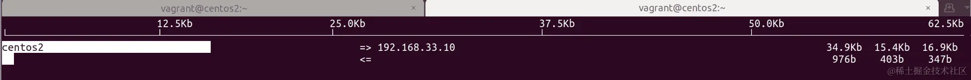 一旦您在centos2上启动了iftop,切换到centos1并运行一个ssh命令,以生成一些流向centos2的网络流量: