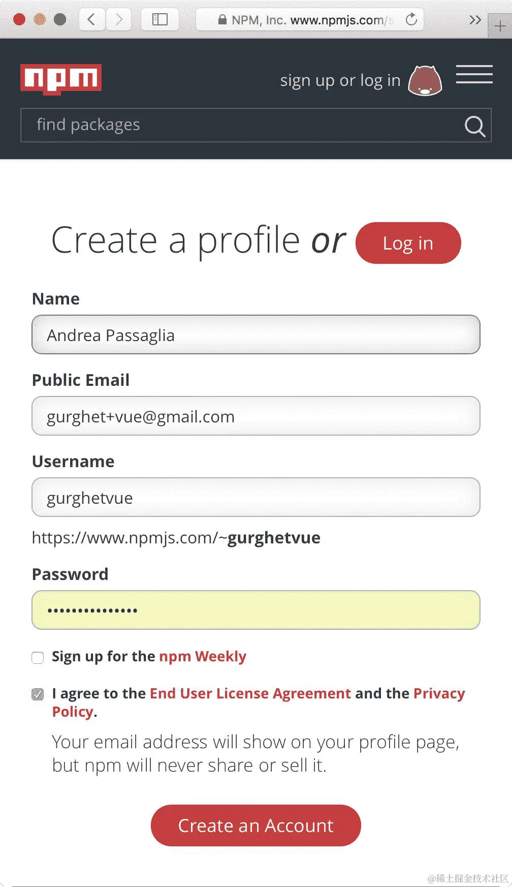 现在你需要去 npm 网站注册一个账号(如果你还没有的话)。