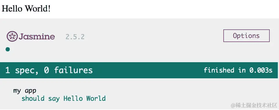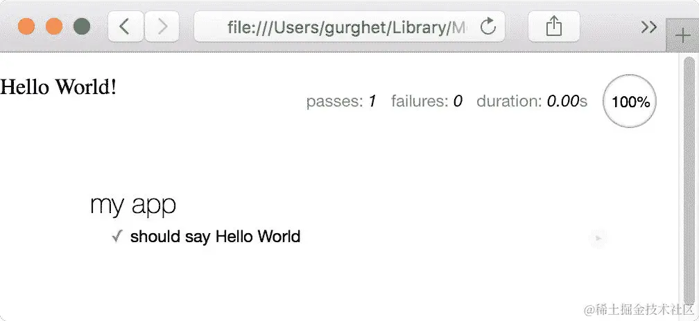 我们编写的测试在网页上读作“我的应用程序应该说 Hello World”。