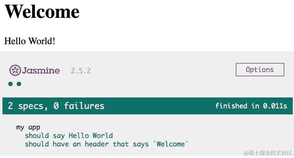 Jasmine 是一个用于测试的库,非常易于使用,并且能够直接在浏览器中显示测试结果。在这个示例中,您将构建一个简单的 Vue 应用程序,并使用 Jasmine 进行测试。
