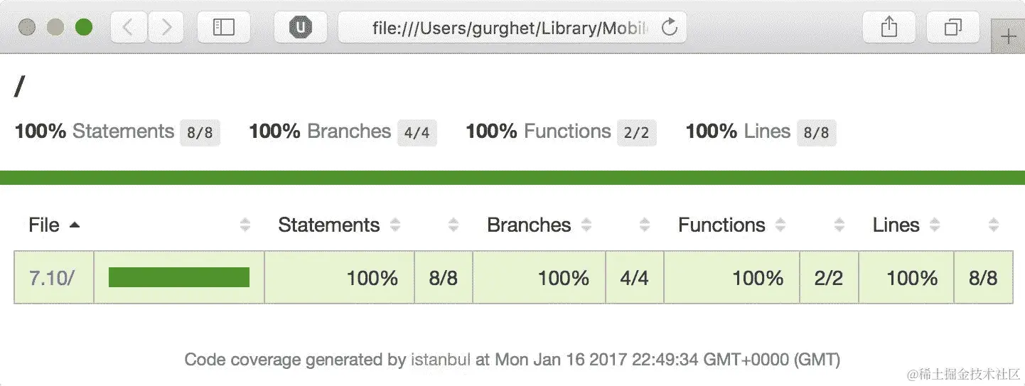 现在尝试启动应用程序。您将在页面末尾看到 Jasmine 的详细报告,告诉您应用程序是否有问题。