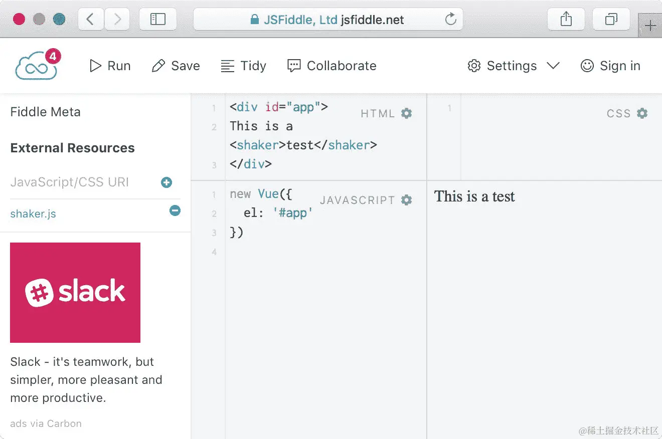 为了使其在 JSFiddle 中工作,需要将 Load Type 设置为 No wrap - in 。如果保持默认的 Load Type onLoad,它将在 Vue 有机会启动之前加载 Jasmine。