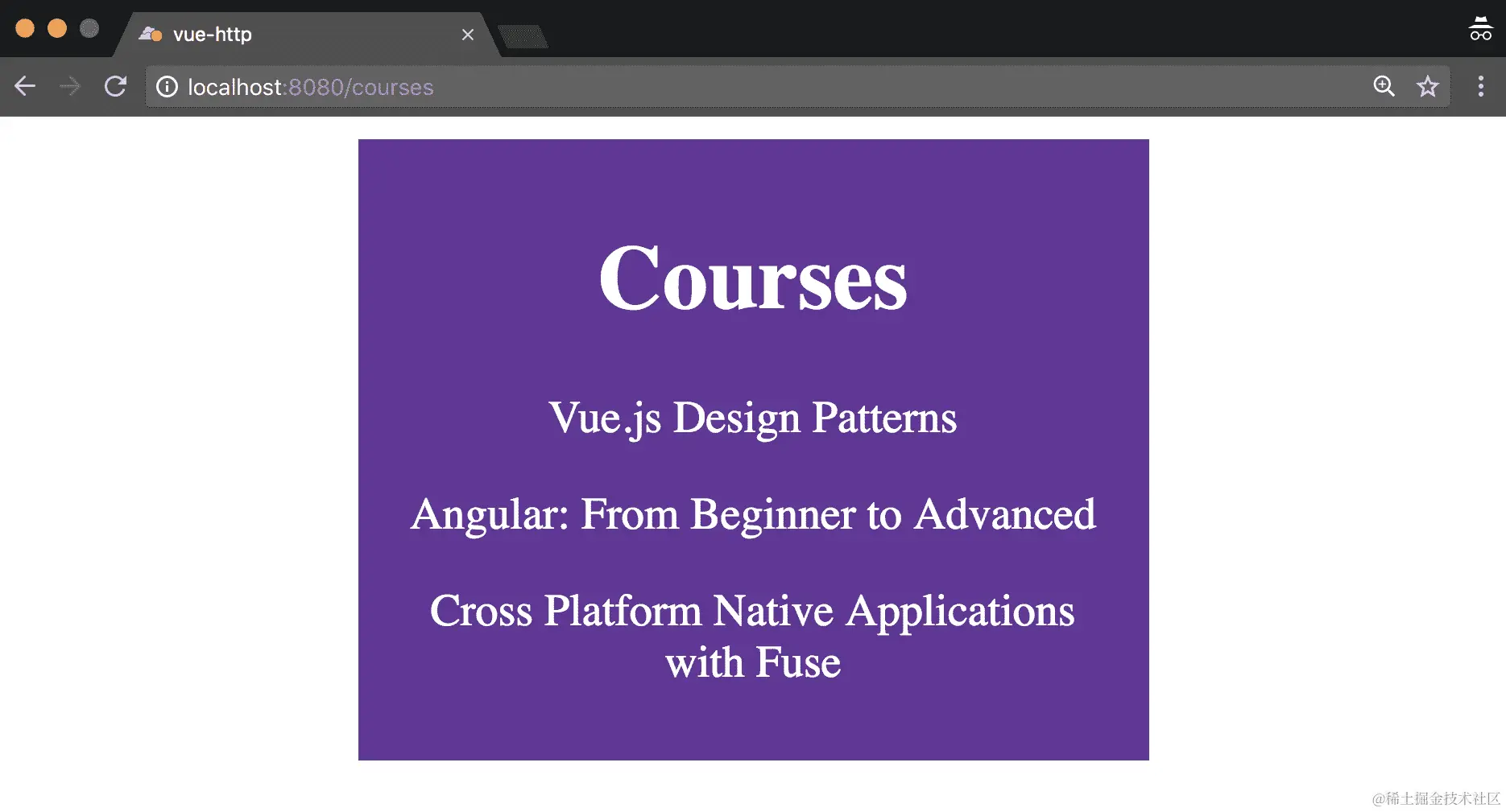 这里发生了什么?我们调用了getCoursesList函数,该函数向我们的http://localhost:3000/courses端点发出了 HTTPGET请求。然后,它要么将课程数组设置为数据(也就是说,我们的db.json中的所有内容),要么仅仅在出现错误时记录错误。