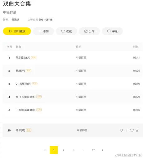 要采集的页面大概长这样,要采集的就是这个列表的数据,歌曲名称、歌手、播放链接,时长四个字段。