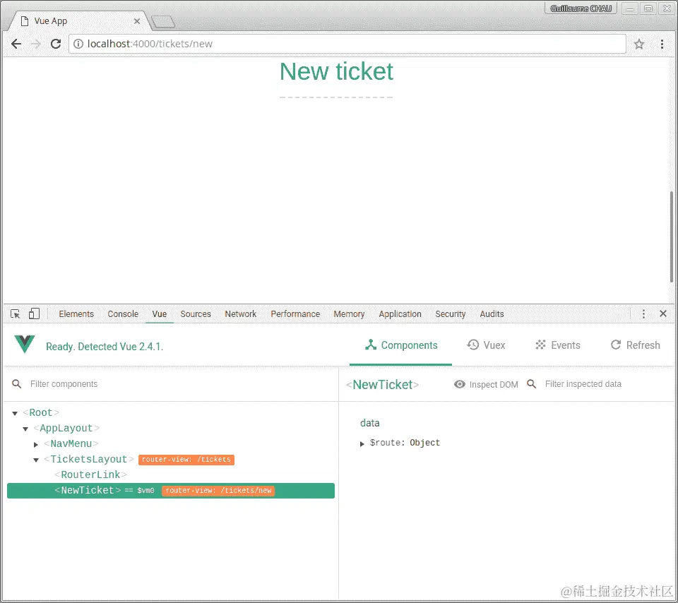 该路由将是票务路线的子路线,并且将采用/tickets/<id>的形式,其中<id>是正在显示的票的 ID。这要归功于 vue-router 的动态路由匹配功能!