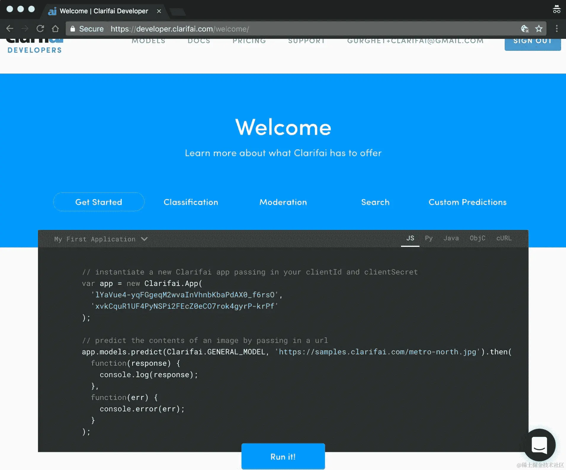 此外,您将需要一个 Clarifai 令牌。要免费获取一个,请访问developer.clarifai.com/并注册。您将看到您应该在应用程序中编写的代码,如下图所示: