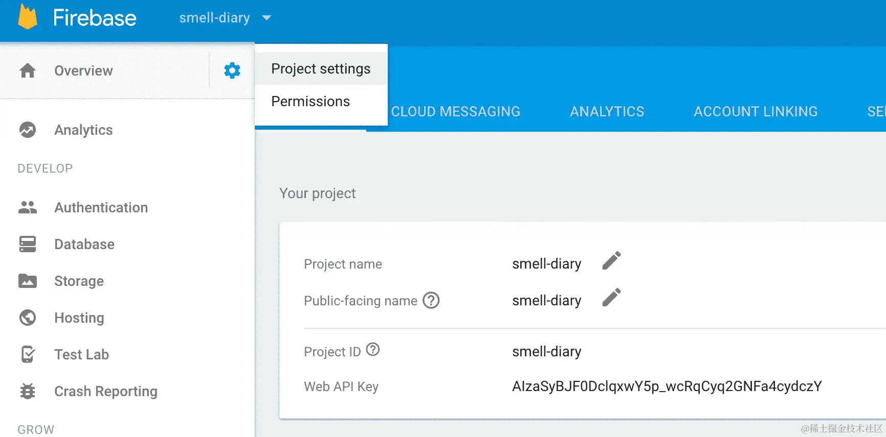 在开始编写代码之前,我们需要创建一个新的 Firebase 应用程序。要做到这一点,您必须登录firebase.google.com/并创建一个新的应用程序。在我们的例子中,它将被称为smell-diary。您还需要记下您的 API 密钥,该密钥可以在项目设置中找到: