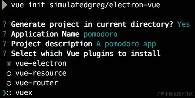 您可以使用默认值进行回答,但当被问及要安装哪个插件时,只需选择vue-electron。使用npm intall安装所有依赖项,如果愿意,您可以在进行必要的修改时保持应用程序处于热重载状态,使用npm run dev。您可以通过点击角落的x来隐藏开发工具: