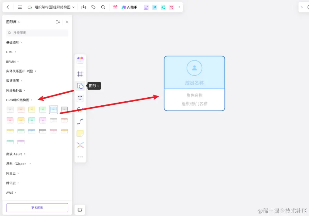 点击 boardmix 白板左侧菜单栏的「图形」工具,打开「图形库」面板,展开其中的 ORG 组织结构图类别,从中任选一个图形,将其拖拽到右侧的白板。