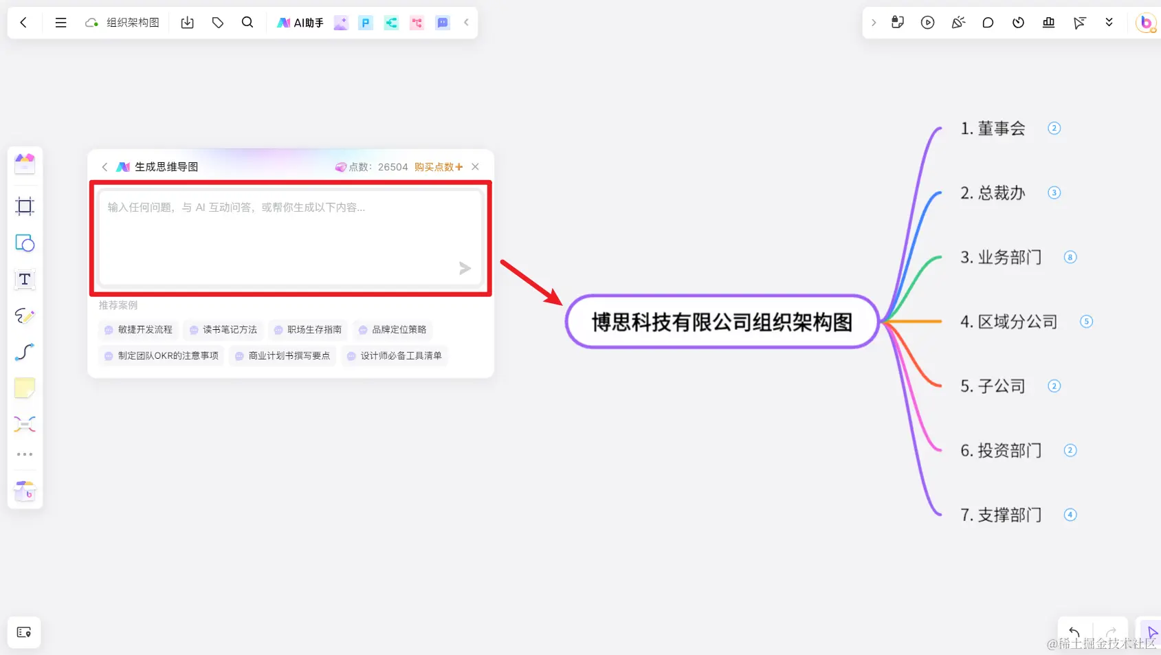 在打开的 AI 绘图面板,输入类似类似「XX 公司组织架构图」,boardmix AI 就会快速绘制一个相应的组织架构图。