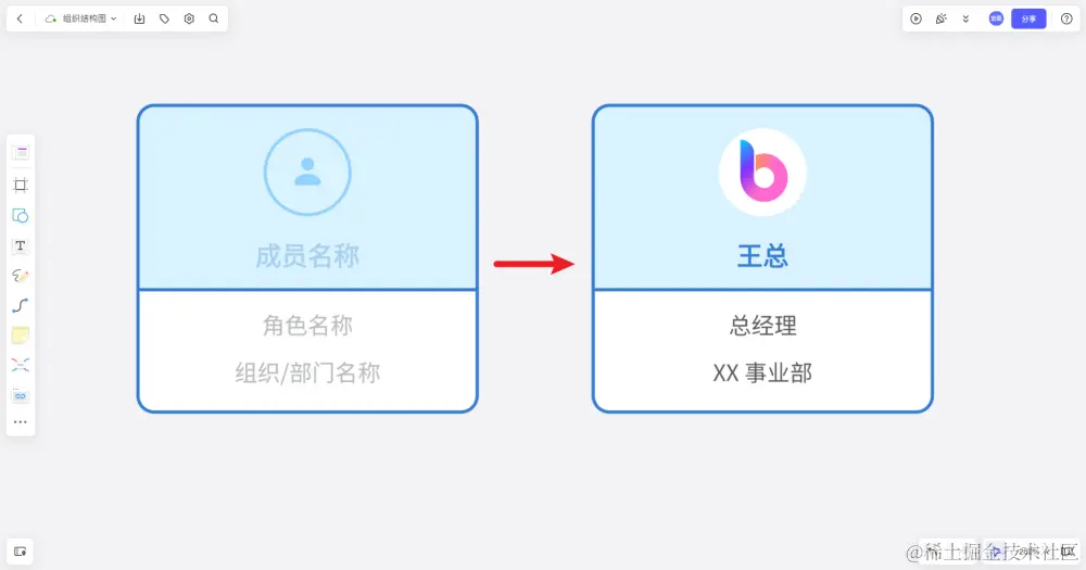 对于插入到白板的组织结构图图元,依次上传图片,编辑成员名称、角色名称、组织/部门名称,就能得到类似下图右侧的效果,上面是个人基本信息,下面是职位和组织/部门名称,编辑其他人的信息时,也是遵循同样的规则,这样就可以让最终制作出来的组织结构图比较规范~