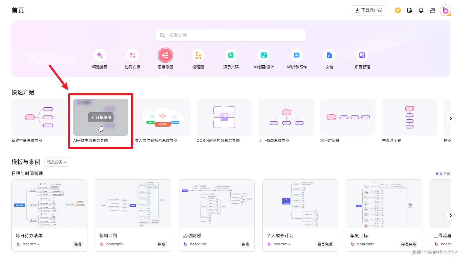 boardmix AI 是集成在 boardmix 在线白板的 AI 工具,因此基于 boardmix AI 来制作组织架构图之前,我们需要在浏览器打开 boardmix 首页,如下图所示,点击「AI 一键生成思维导图」,打开 AI 绘图的面板。