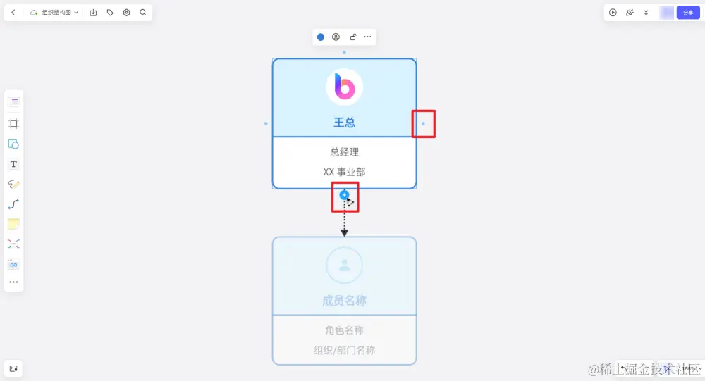 在已有一个图元的情况下,boardmix 博思白板支持快速制作相同的图元,方法也非常简单:选中当前的图元,点击图元四周的蓝色小圆点,就可以快速制作相同的图元,如下图所示。