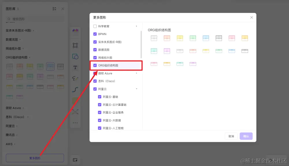 如果你在图形库面板中没有看到「ORG 组织结构图」类别,可以点击图形库面板底部的「更多图形」,打开下图的「更多图形」面板,勾选「ORG 组织结构图」左侧的复选框,这样 ORG 组织结构图类别就会展示在图形库面板中。