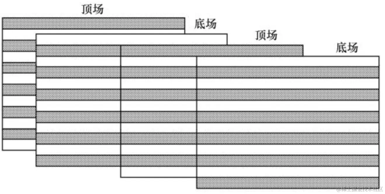 - 隔行扫描将一帧分为两场,每场由若干行组成,先扫描奇数行得到顶场,隔一段时间再扫描偶数行得到底场,两个场都显示才为一帧的完整画面