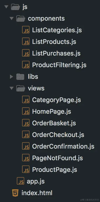 为每个组件、视图和库(如 Vue、Vuex 和 Vue-router)创建一个文件。然后,为每种类型的文件创建一个文件夹。最后,添加一个app.js - 这是初始化库的地方。