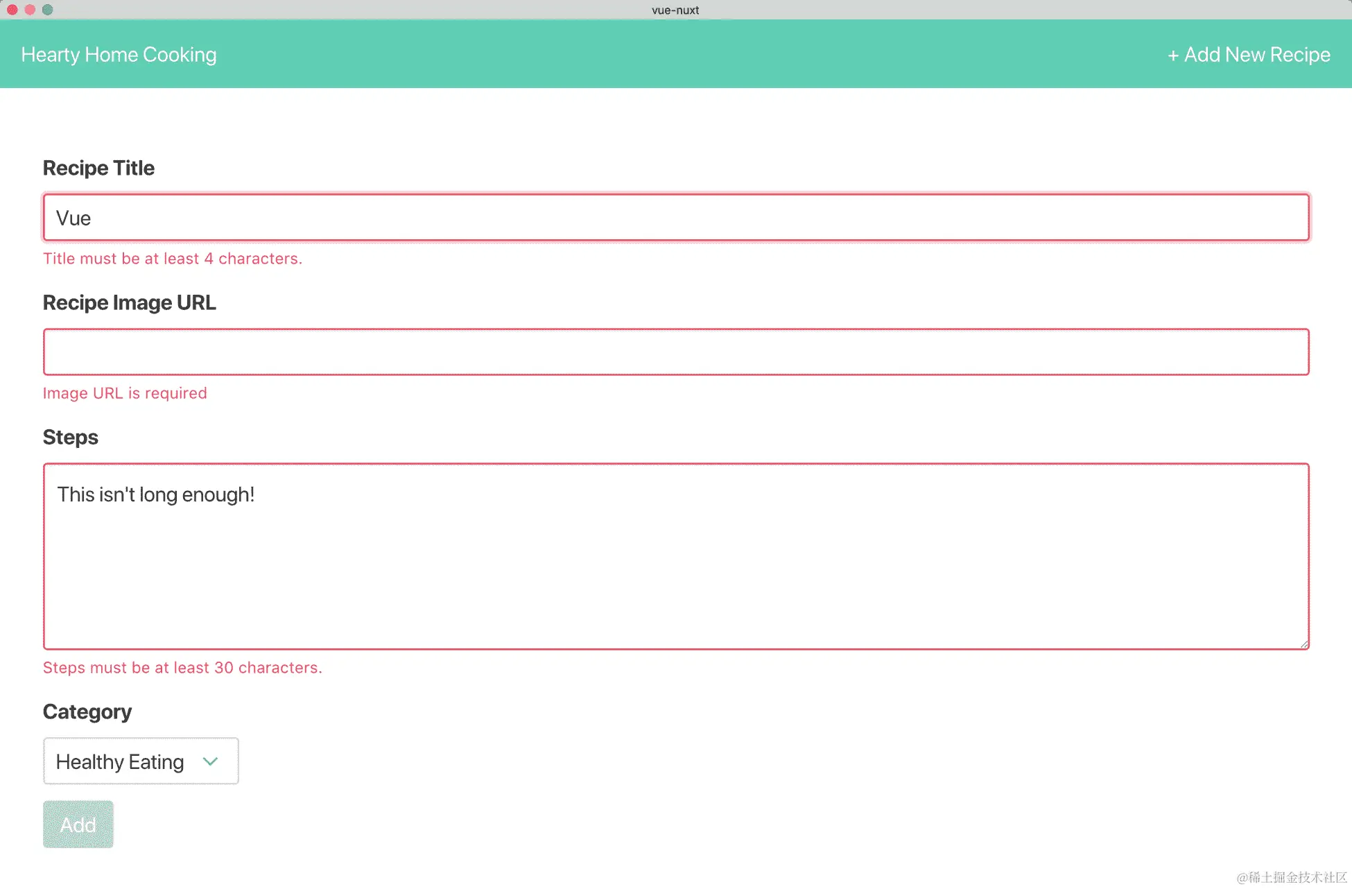 让我们在pages/Recipes/new.vue下创建一个新的路由;这将生成一个到localhost:3000/recipes/new的路由。我们的实现将是简单的;例如,将食谱步骤作为string可能不是生产的最佳选择,但它允许我们在开发中实现我们的目标。