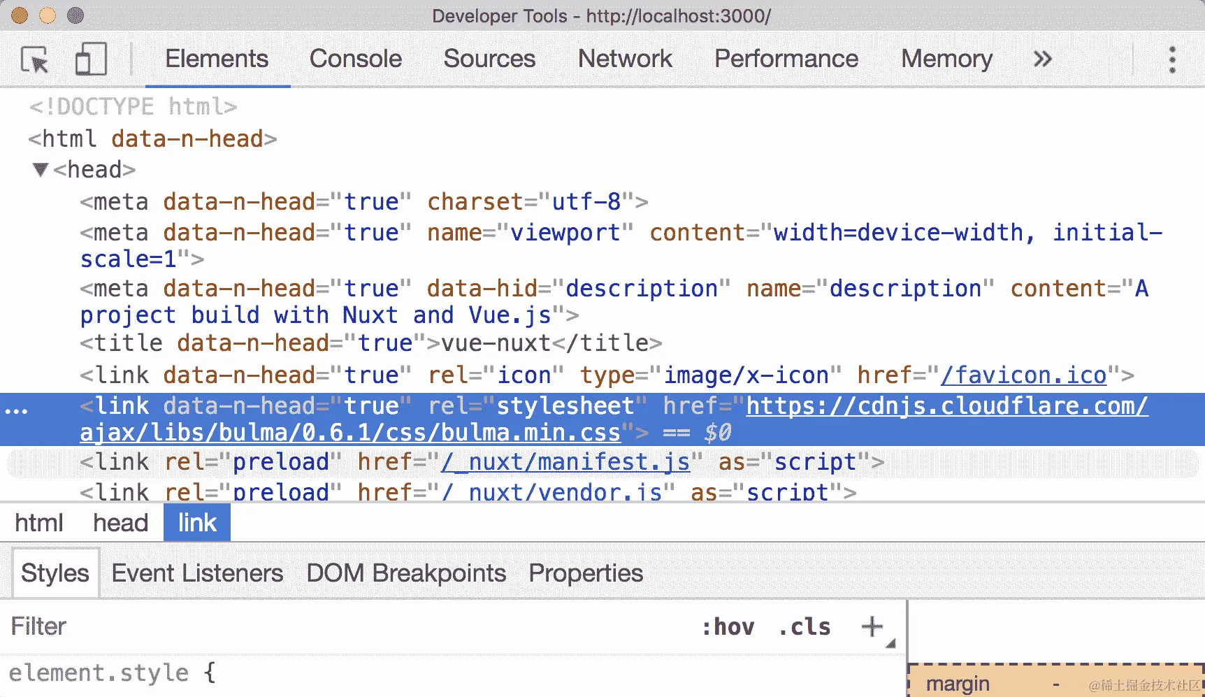 添加文件后,我们需要告诉 Nuxt 我们要将其用作.css文件。将以下代码添加到您的nuxt.config.js中: