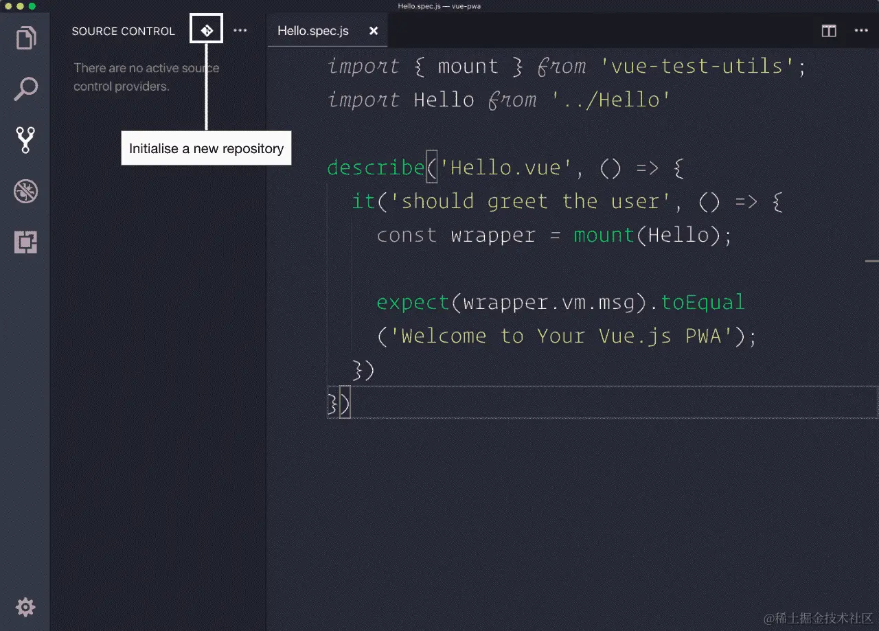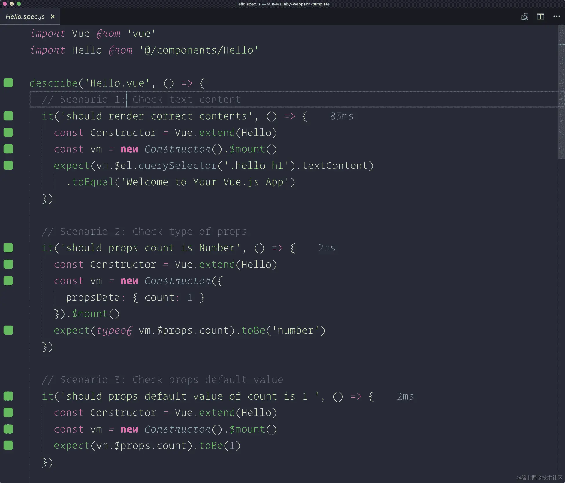 让我们首先调查test/unit/specs目录。这是我们在测试 Vue 组件时放置所有单元/集成测试的地方。打开HelloWorld.spec.js,让我们逐行进行:
