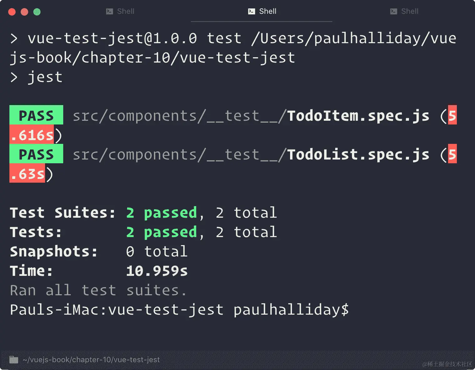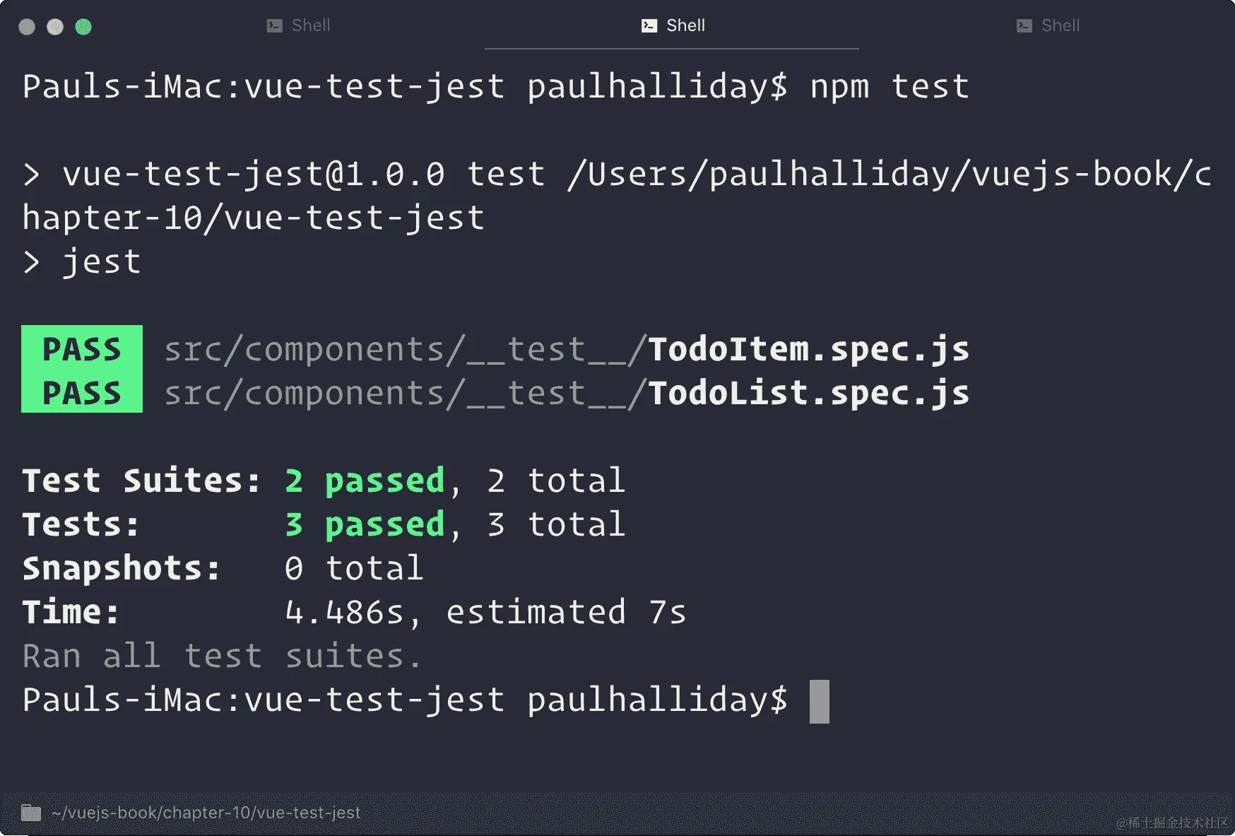 这意味着任何时候我们想要运行我们的测试,我们只需在终端中运行npm run test。这将在任何匹配*.spec.js名称的文件上运行 Jest 的本地(项目安装)版本。