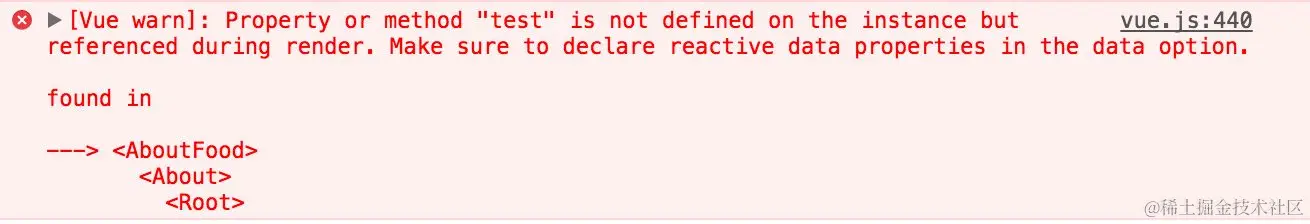 例如,如果您尝试在 food 组件中输出一个不可用的变量{{ test }}。默认情况下,JavaScript 控制台错误如下所示: