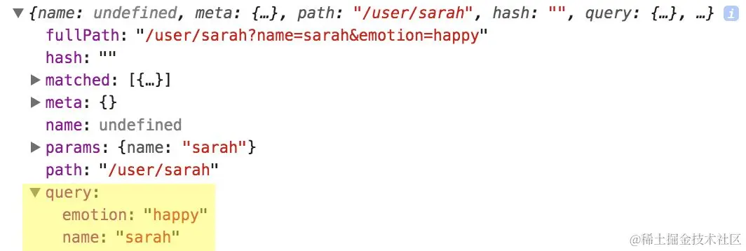 <router-link :to="{name: 'user', query: { name: 'sarah', emotion: 'happy' }}">