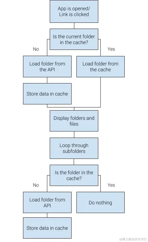 预缓存不仅用户当前所在的文件夹,还包括子文件夹。这将通过循环遍历当前显示的文件夹并检查它们是否已经被缓存来完成。如果没有,我们可以从 API 中获取数据。