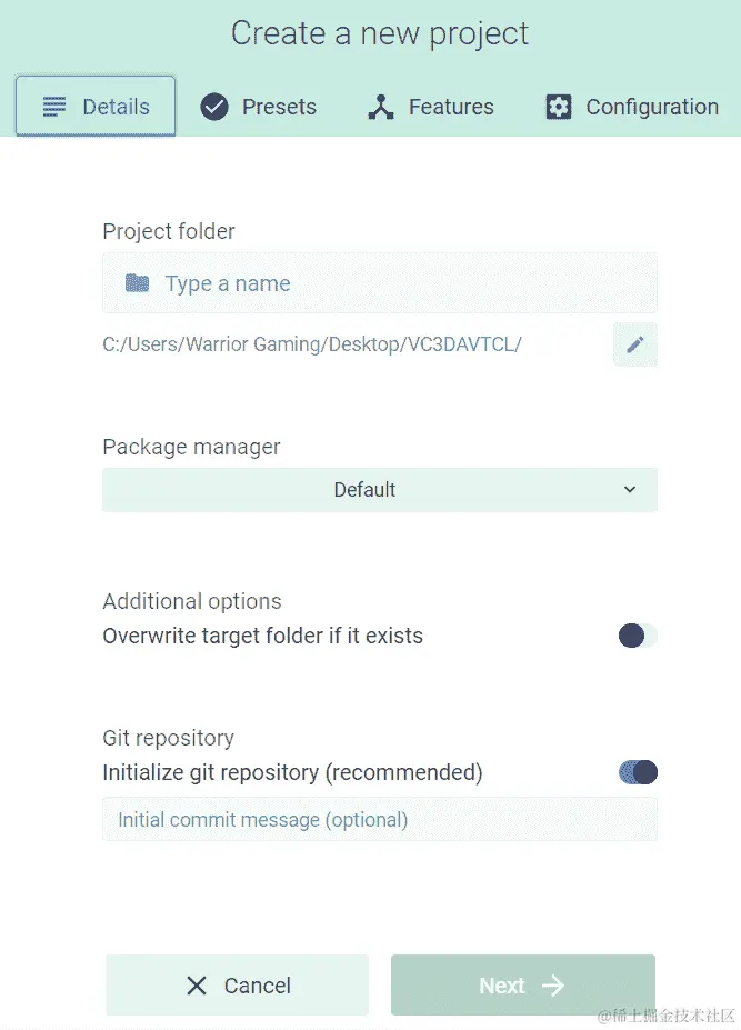 在选项列表中,我们可以看到-d代表--default标志,跳过提示并使用默认预设,而-b选项是--bare标志的简写,用于在不带初学者说明的情况下搭建我们的项目。