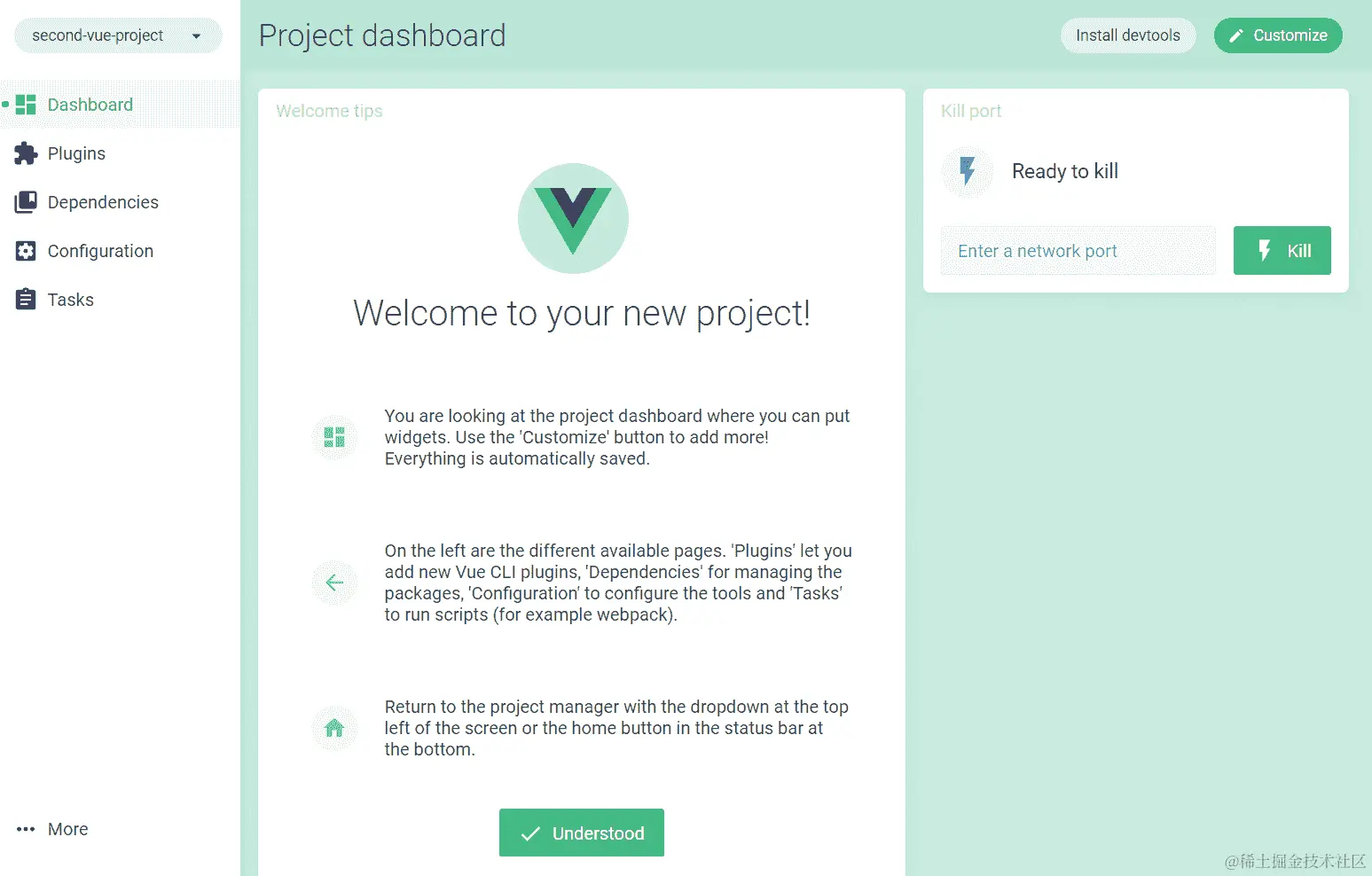 Vue CLI 就是这一成功的又一个例子。除了一个与其他现代前端框架相匹敌的命令行界面外,Vue CLI 3 还在前端 JavaScript 框架中树立了新的标准,并配备了图形用户界面(GUI)。这个界面使得设置、扩展、运行和服务一个 Vue 项目变得轻而易举。
