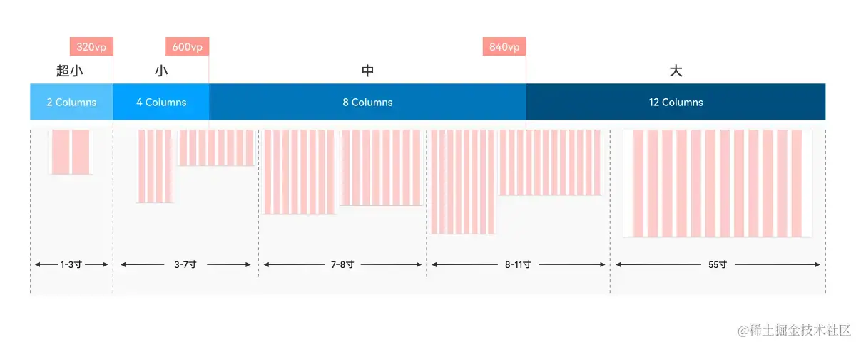 根据设备的水平宽度,OpenHarmony提供了断点系统,覆盖超小、小、中、大 四种屏幕类型,并结合栅格系统默认提供了对应 Column 的数量关系。不同的设备根据自身屏幕水平宽度,在不同的断点范围,系统将自动匹配不同数量的栅格。应用也可针对具体界面自定义栅格。